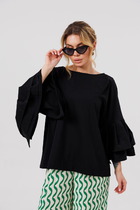 Блузка женская с акцентным декором полуприлегающего силуэта. Рукав "летучая мышь" с подрезом по линии проймы и односторонними складками и манжетой. Застежка- планка на петли и пуговицы. Воротник стояче-отложной. В качестве декора - дополнительный воротник, плавно переходящий в цветок. Благодаря своему крою станет базовой вещью в вашем гардеробе. Легко сочетается с любыми брюками, юбками, платьями и джинсами. Позволит создать большое количество образов для офиса, прогулок, праздничных мероприятий. Длина блузки (50-54)- 58см, (56-60)-61 см . Длина рукава от горловины с манжетой (50-54)-68см, (56-60)-70см.