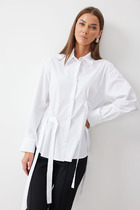 Короткий цельнокроеный рукав придает образу динамичность и современность, делая силуэт еще более выразительным. Асимметричный низ с кулиской создает игривый объем, позволяя регулировать степень свободы и добавляя нотку неожиданности в привычный образ.