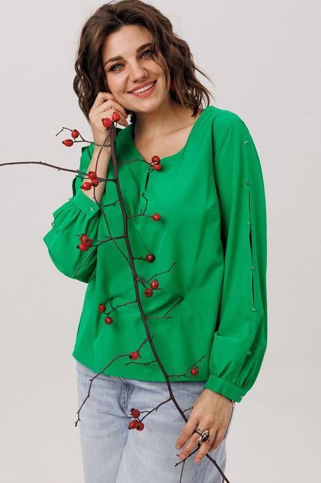 Мягкая ткань драпируется полуприлегающим силуэтом, ласково обрисовывая линии фигуры. Особое внимание притягивают рукава: втачные, с элегантными разрезами по всей длине, они завершаются манжетами на пуговицах, украшенными навесными петельками - деталь, придающая образу неповторимый шарм.