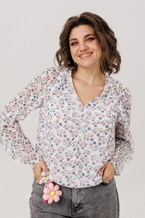 Окутанная лёгкостью воздушного шифона с пленительным принтом «клевер», эта блуза становится воплощением нежной элегантности. Её прямой силуэт, струящийся вдоль фигуры, украшен едва уловимыми сборками у груди, добавляющими мягкий объём.