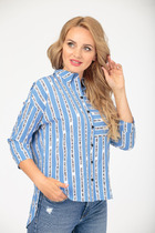Блузка прямого силуэта. Горловина обработана отложным воротником-стойкой, по переду расположены симметричные складки и декоративная капелька, по спинке с застежкой на навесную петлю и пуговицу. Спинка со средним швом. Рукав втачной прямой длинный, по низу со сборкой и манжетой с застежкой на петли и пуговицы.