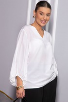 Блузон длины макси выполнен из ткани молочного цвета. Силуэт свободный. Бретели регулируемые. Лиф отрезной фигурный, двойной, по бокам выточки. Без подкладки. Застёгивается от груди на ряд пуговиц. Длина по спинке 112 см
