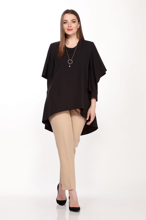 Блузка женская свободного силуэта выполнена из блузочной ткани с добавлением эластана, горловина круглая на обтачке, перед короче спинки, по спинке застегивается на петли и пуговицы. Рукав втачной  3/4 фигурный на манженте с пуговицей. Длина блузки по переду 58 см, по спинке 89 см (украшение в комплект не входит)
