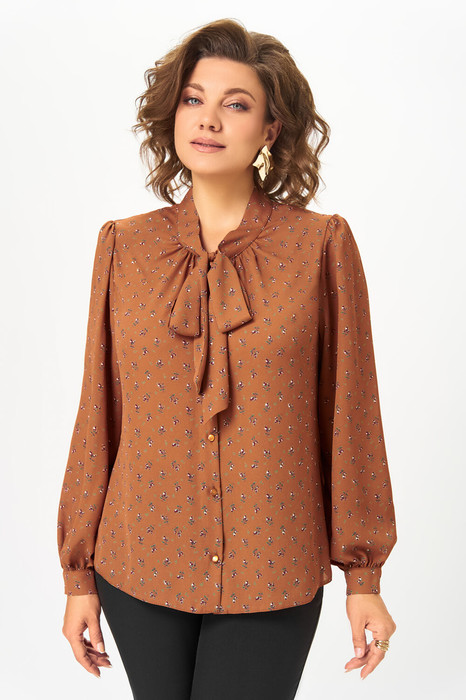 Блузка женская прямого силуэта, с центральной застежкой по переду на петли и пуговицы. По горловине переда-легкая сборка, воротник стойка, переходящая в бант.