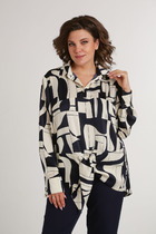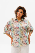 Блуза женская шикарная нарядно - повседневнаая полуприлегающего силуэта на подклдке, выполнена из красивого шифона с принтом. Вырез горловины воротник на стойке рубашечного типа, рукав втачной по низу с притачными воланми. Застежка доверху на обметанные петли и пуговицы, низ блузы фигурный (по спинке длиннее). По переду блузы притачные воланы, в боковых швах обработаны разрезы. Декором блузы служит принт амой ткани и отделочные элементы в виде воланов.