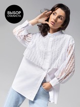 Блузка свободного силуэта из струящейся шифоновой ткани. Перед и спинка с кокеткой и сборкой. Рукав спущенный свободный с резинкой понизу. Вдоль линии кокетки и рукава вставлена рюша. Горловина V-образной формы с воротником стойкой переходящей в бант. Длина блузки - 67 см, длина рукава - 60 см.