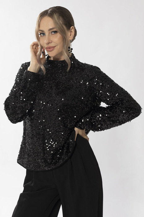 Блузон с отрезной стойкой горловины, застежкой на две навесные петли и пуговицы по стойке горловины спинки. По переду с нагрудными вытачками. Спинка со средним швом. Рукав втачной, длинный, с отрезной манжетой. По шву притачивания манжеты рукав присборен.