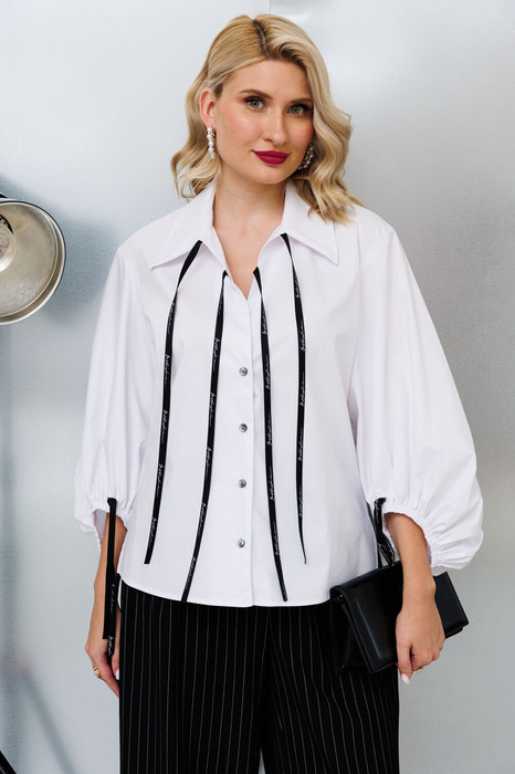 Блузка прямого кроя с обьемными рукавами. По переду расположена застежка на пуговицы, декоративные ленты, которые можно завязать на бантики, либо оставить свободными. Рукав снизу на резинке, и декоративной тесьмой.