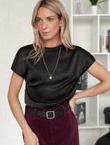 Блузон свободного силуэта со спущенной линией проймы и укороченным втачным рукавом длиной 26 см. Горловина округлая, оформлена планкой 2,8 см. Длина блузона по спинке 65-68 см (в зависимости от размерного ряда). Низ изделия и рукавов обработаны открытым срезом. Верхние детали изделия отлетные и имитируют силуэт майки без рукавов и состоят из мерцающего трикотажного полотна с пайетками.