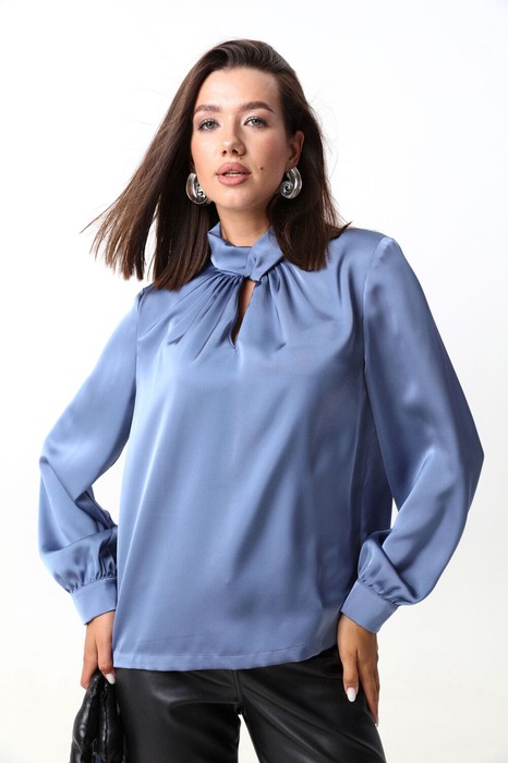 Блуза из плотной струящейся ткани с атласным эффектом объёмного кроя с воротником-стойкой и сборкой по горловине. Манжеты с застёжкой на две пуговицы, легкая сборка по низу рукавов.                                                                                                                      Рост фотомодели 175 см. Размер у фотомодели – 44.