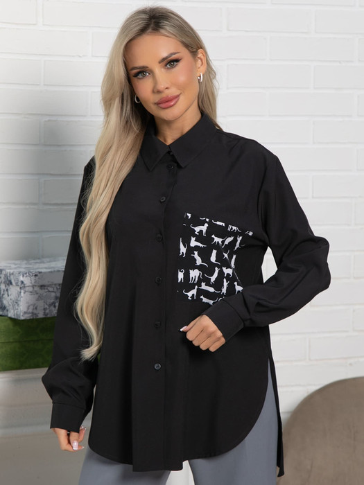 Стильная, удобная и функциональная рубашка в классическом цвете подойдёт для повседневной носки. Модель представлена в больших размерах, что делает её универсальным выбором для разных типов фигур. Рубашка свободного кроя с длинными рукавами на манжетах с пуговицей, с втачным воротником, застёжка на пуговицы по всей длине. Карман из отделочной ткани, расположенный на груди, придаёт рубашке лаконичный акцент. Высокие разрезы по боковому и закруглённая линия низа по полочке дают возможность менять образы. С такой рубашкой вы всегда будете выглядеть стильно, красиво и модно.