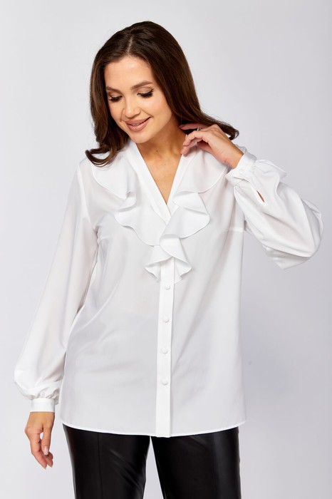 Нарядная блузка из струящейся ткани с застежкой на планку и пуговицы. На полочке по горловине волан, входящтй в планку.Рукав расширенный к низу со складками на манжете. Вырез V-обраный. В боковых швах по низу разрезы
