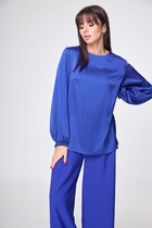 Блузка женская c рубашечным воротником, свободного силуэта с кокетками спинки и полочек. По спинке заложена встречная складка, плечо спущенное. Рукав прямой, втачной с манжетой на застёжку петля-пуговица. По низу изделия пояс-кулиска со шнурком, завязывающимся в бант. По воротнику, по кокеткам и по плечевым швам отделочная строчка.