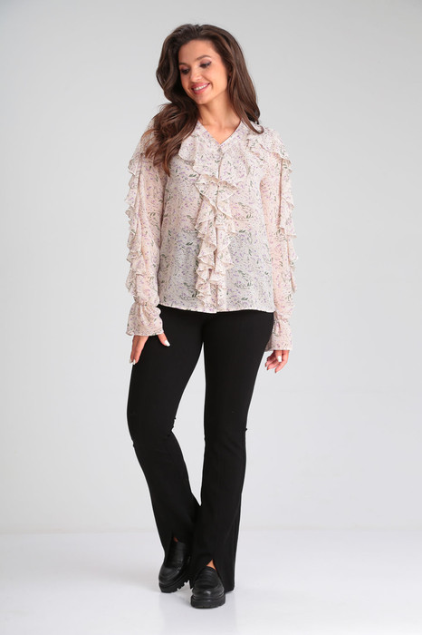 Стильная блузка прямого силуэта из плотного креп-шифона. Изделие с центральной планкой на застежку петли пуговицы по полочке и воланами вдоль планки. ГорловинаV-образной формы. Рукав втачной с центральным швом и воланом по низу и со сборкой на эластичную ленту в 8см от края рукава. Спинка изделия цельная.