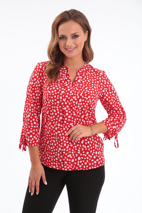 Женская  блузка  с  V-образным вырезом. Модель c воротником стойкой. Рукав втачной длинной  за локоть и шнуровкой-стяжкой.  Передние полочки блузы с нагрудными вытачками. По спинке  планка с застежкой на  пуговицы.
