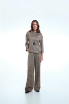 Блуза свободного прямого кроя прямого силуэта с V-образным вырезом. Воротник стояче-отложной рубашечного типа, застёгивается на пуговицу и петлю. Рукава объёмные, собраны на резинку. В боковых швах и по переду разрезы.