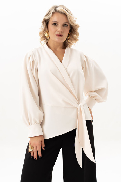 Оригинальная женственная блуза  на запах с вырезом станет незаменимой вещью в Вашем гардеробе. Всесезонная блуза с длинными рукавами на манжетах легко впишется в Ваш повседневный, вечерний, а также деловой офисный стиль. Роскошная блузка сочетает в себе легкость и комфорт. Блуза с отрезной баской  и воротником стойкой переходящей в борта. Застежка на потайную петлю и пуговицу и на завязки. Рукав длинный, втачной на манжете. По окату рукава обработаны складки. Вы сможете носить эту блузу не только летом, но и осенью, зимой и весной. Стильная женская блуза класса люкс соответствует модным тенденциям 2025-26 года. Ткань отлично тянется и обеспечивает идеальную посадку по фигуре. Мы уверены, что высокое качество Вас не разочарует! Широкий размерный ряд, включающий большие размеры, позволит Вам подобрать подходящий размер. Праздничная блузка скроет несовершенства фигуры, выгодно подчеркивая ваши красоту, женственность и индивидуальность. Элегантная и красивая блуза станет идеальным вариантом как для торжественных мероприятий: выпускной, корпоратив, свадьба, любой другой праздник, Новый год, так и для деловых и повседневных встреч, офиса. Нарядная модная блузка отлично подойдет для фотосессии, похода в театр и свидания. Сезоны, когда вы сможете ее носить: осень, зима, весна.