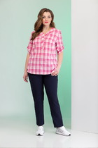 Практичная повседневная блузка прямого силуэта, выполнена из мягкого трикотажного полотна Футер. Блузка по переду и спинке с притачными кокетками, спинка со средним швом. Горловина переда и спинки в форме лодочка обработана узкой притачной планкой. Блузка с оригинальными короткими рукавами с открытыми плечами. Длина рукава в 48 р-ре – 18 см. в 60 р-ре – 18 см., ширина рукава по низу в 48 р-ре – 36 см.В В 60 р-ре – 44 см. По верхним срезам рукавов и швам притачивания кокеток переда и спинки широкая отделочная планка. Блузка без застежек и подклада. Длина изделия по спинке в 48 р-ре – 57 см. в 60 р-ре – 63 см.