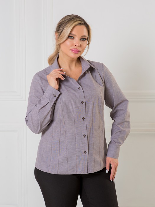 Удобная повседневная блузка, полуприлегающего силуэта, выполнена из неэластичной плательной ткани. Блузка по переду с двумя рельефными швами, вертикальными вытачками и центральной застёжкой на петли и пуговицы. Спинка с двумя рельефными швами. По рельефным швам переда и спинки, вертикальным вытачкам переда проложены отделочные строчки нитками контрастного цвета. Горловина переда и спинки с втачным отложным воротником на стойке. Рукав втачной длинный с притачным манжетом по низу с застежкой на петли и пуговицы. Длина рукава от плеча в 50 р-ре – 60 см. в 64 р-ре – 63 см., ширина рукава по низу в 50 р-ре – 21 см. в 64 р-ре – 24 см. Блузка без подклада. Длина изделия по спинке в 50 р-ре – 65 см. в 64 р-ре – 71 см.