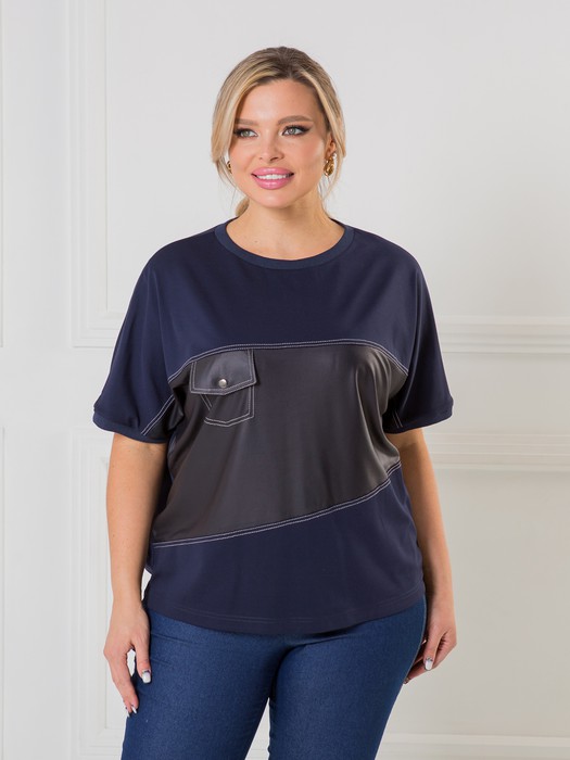 Повседневная блузка свободного силуэта, выполнена в сочетании трикотажного полотна и тонкой эко-кожи. Блузка с цельнокроеным коротким рукавом и свободной заниженной проймой. Длина рукава от горловины в 50 р-ре – 36 см. в 64 р-ре – 42 см., ширина рукава по низу в 50 р-ре – 36 см. в 64 р-ре – 48 см. Перед из трех частей с имитацией нагрудного кармана с клапаном. Средняя часть переда и клапан выполнены из отделочной ткани. Швы притачивания средней части переда, клапан и имитация кармана настрочены двойной отделочной строчкой, выполненной нитками контрастного цвета. Спинка со средним швом. Горловина переда и спинки, низ рукавов обработаны планками из отделочной ткани – рибана. Блузка без застежек и подклада. Длина изделия по спинке в 50 р-ре – 61 см. в 64 р-ре – 69 см.