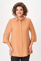 Блуза прямого силуэта, слегка расширена к низу. Выполнена из хлопковой ткани решелье. Горловина округлой формы, на спинке переходящая в капельку с застежкой на петлю и пуговицу. На переде расположены нагрудные вытачки, идущие из бокового шва. Рукав втачной, короткий, со сборкой по окату и резинкой по низу.