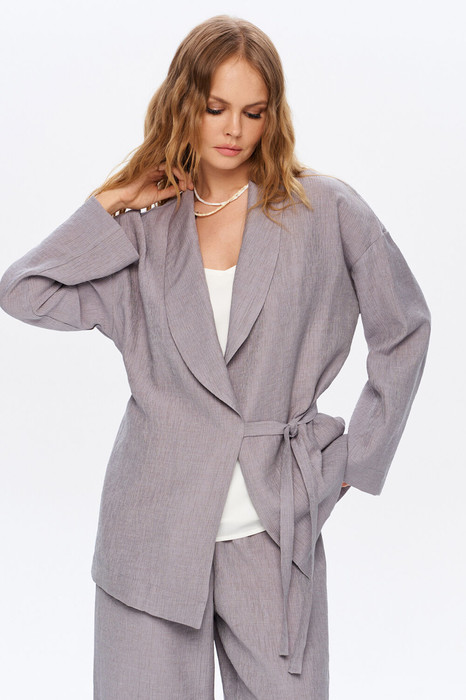 Детали: блуза полуприлегающего силуэта, свободный покрой, спущенная линия плеча, шалевый воротник, длинные широкие рукава с высокой подгибкой, карманы в боковых швах.