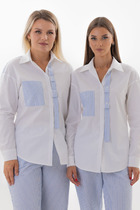 Детали: блуза приталенного силуэта, перед и спинка свободного покроя, пояс блузы со сборкой, расширенные плечи, сборки по плечам и горловине, застёжка на потайную молнию в боковом шве, воротник стойка со сборкой и застёжкой на навесные петли и пуговицы, втачные расширенные к низу рукава с резинкой по низу.
