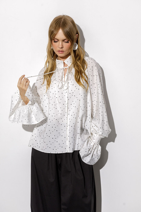 Свободная блуза в горохи с воротником-стойкой и широкими манжетами (приобрести брюки с фото можно по арт. 6782).