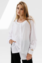 Блуза из мягкой струящейся ткани. Свободный, стильный, удобный и отличный выбор для ярких дней. Блузка прямого силуэта свободной формы с коротким рукавом с патой на пуговице. Перед с нагрудными вытачками. Вырез горловины округой формы. Полочка оформлена поперечной складкой и декоративным элементом в виде имитации застежки на пуговицы. Прекрасный выбор для любого гардероба в сочетании с брюками, джинсами или юбками. Длина изделия по спинке 77 см. Длина рукава 37 см.