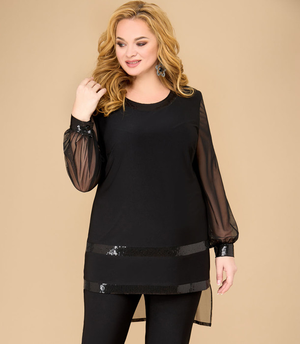 Блузка прямого силуэта с втачным рукавом. Горловина округлая с планкой по переду. Рукав длинный, по низу со сборкой и притачной манжетой с застежкой на петлю и пуговицу. Рукав и нижняя деталь спинки из сетки. Низ блузки асимметричный, спинка длиннее переда. Планка по горловине, низу переда и манжеты выполнены из отделочного материала.