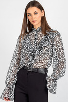 Блузка женская из хлопковой ткани, прямого силуэта с втачным рукавом. Линия плеча слегка спущена. Застежка центральная на петли и пуговицы. Воротник отложной с лацканами. Перед с вытачками по линии груди. По левой части переда накладной карман с отделкой. Рукав длинный рубашечный, по низу притачная манжета с застежкой петли и пуговицы. Линия низа фигурная.