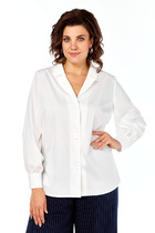 Рубашка женская прямого силуэта с втачным спущенным рукавом. Рубашка выполнена из мягкого трикотажа с отделкой из гипюра для создания стильного и комфортного образа. По горловине отложной воротник на стойке. Застежка центральная на петли и пуговицы. По спинке кокетка и складки из-под кокетки. Рукав длинный по низу притачная манжета с застежкой на петлю и пуговицу.   Фигурные вырезы по низу обеспечивают свободу движений и комфорт.