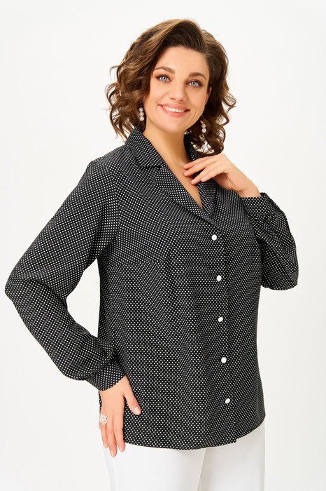 Блузка женская прямого силуэта из вискозной ткани с центральной застёжкой на петли и декоративные пуговицы. Полочки с нагрудными вытачками, спинка цельная. Воротник отложной с лацканами пиджачного типа. Рукав втачной одношовный, внизу со сборкой и притачной манжетой, которая застёгивается на петлю и декоративную пуговицу.