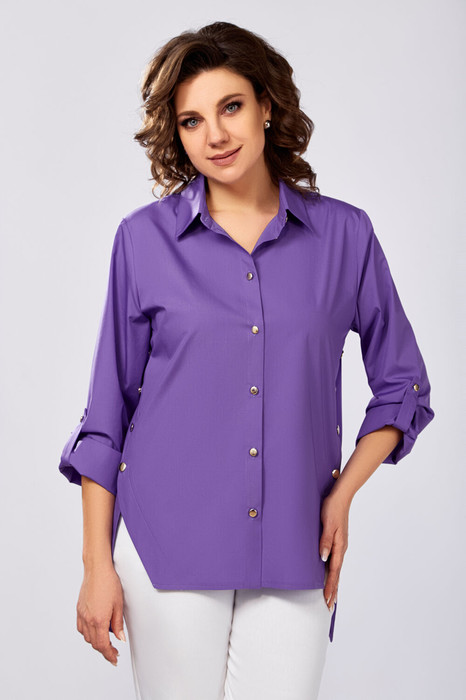 Рубашка женская прямого силуэта с центральной застёжкой на петли и декоративные пуговицы, выполнена из хлопчатобумажной ткани. Боковые швы полочки и спинки имеют фигурную форму и соединяются между собой застёжкой на петли и декоративные пуговицы. Воротник рубашечный, отложной на стойке. Рукав втачной, одношовный, длинный с манжетой, которая застёгивается на петлю и пуговицу, и патой, которой регулируется длина рукава. Низ рубашки разноуровневый, полочка короче, спинка -длиннее.