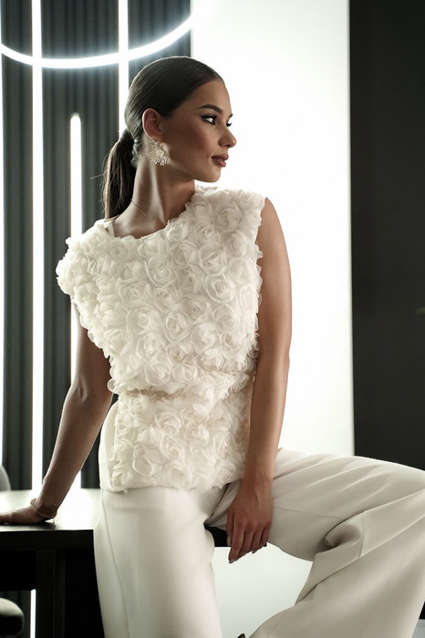 Блузка прямого силуэта со спущенным плечом. Перед из фактурной ткани «розы на сетке», спинка из полупрозрачной ткани «органза».  Горловина округлой формы, по спинке застежка на навесную петлю и пуговицу. Перед на атласной подкладке. Длина 59 см.