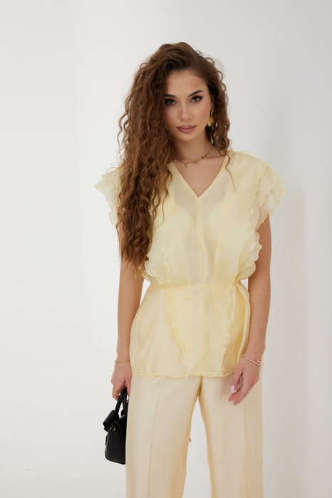 Блузка женская прямого силуэта, длиной до уровня бедер, с воланами, образующими рукава-«крылышки», по переду воланы до низа, по спинке входят в рельефы на уровне талии. Вырез горловины V-образной формы. Спереди под верхний волан вставлен пояс-шнурок, завязывающийся вокруг талии. Длина 68 см.