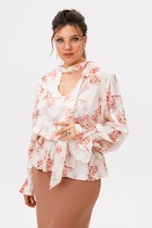 Блузка с короткими рукавами. Сзади - застежка в виде змейки. Спереди посередине модель украшена вертикальной планкой с интересным рисунком. Длина изделия - 61 см.