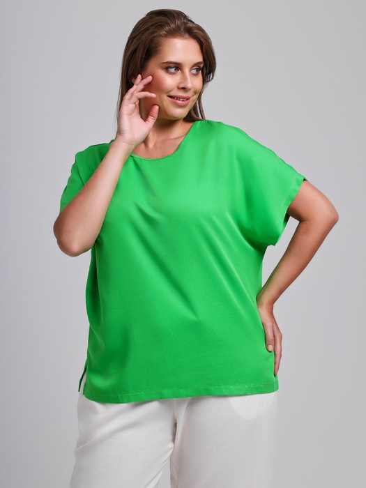 Блуза женская из гладкокрашеного тканого штапельного полотна, прямого силуэта, с горловиной овальной формы и цельнокроеными рукавами. Горловина окантована основным материалом, в боковых швах разрезы.