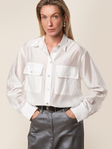 Блуза (рубашка) женская из тканого синтетического полотна с набивным рисунком, свободного покроя, с V- образным вырезом горловины, короткими втачными рукавами, центральной бортовой застежкой на обметанные петли и пуговицы. В боковых швах разрезы, по низу рукавов манжеты, горловина обработана обтачкой.