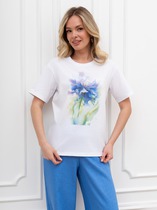 Свободный крой блузки и спущенная линия плеча дарят ощущение легкости и непринужденности, делая образ одновременно женственным и современным. Широкие рукава средней длины гармонично дополняют образ и идеально подходят для полных рук, обеспечивая комфорт, свободу движений и уверенность. Аккуратная застежка на маленькую пуговицу добавляет утонченности, а круглый вырез красиво обрамляет шею, создавая аккуратную линию декольте.