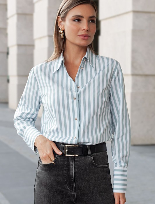 Состав: 65%Хлопок 35%ПЭ Плотность: 100 Г/м2 Параметры модели на первом фото: Рост 170, бюст 89, талия 63, бедра 92Блузка свободного силуэта выполнена из смесовой струящейся ткани. Модель в вертикальную полоску дополнена золотистыми рельефными пуговицами. Свободный силуэт подходит для любой фигуры. Для идеального роскошного образа используйте в качестве низа брюки светлых тонов. На спинке изделия фирменный металлический логотип бренда.