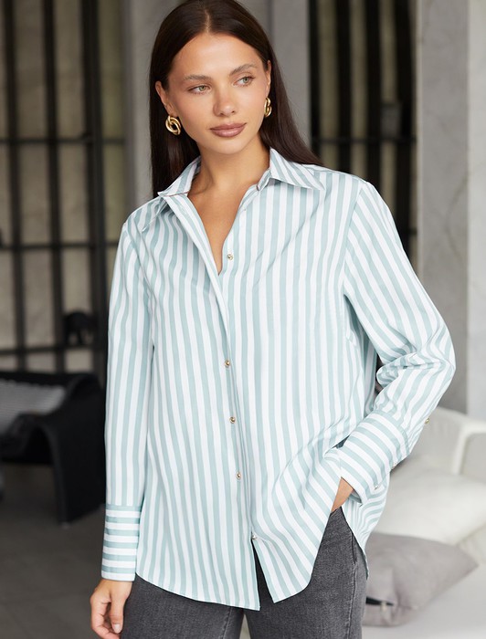 Состав: 65%Хлопок 35%ПЭ Плотность: 100 Г/м2 Параметры модели на первом фото: Рост 170, бюст 89, талия 63, бедра 92Блузка свободного силуэта выполнена из смесовой струящейся ткани. Модель в вертикальную полоску дополнена золотистыми рельефными пуговицами. Свободный силуэт подходит для любой фигуры. Для идеального роскошного образа используйте в качестве низа брюки светлых тонов. На спинке изделия фирменный металлический логотип бренда.