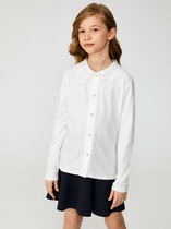 Блузка для девочки из трикотажного полотна с коротким рукавом-фонарик со сборкой по окату и нижнему срезу рукава. Вырез горловины округлый, оформлен кружевной тесьмой.На полочке декоративная планка.