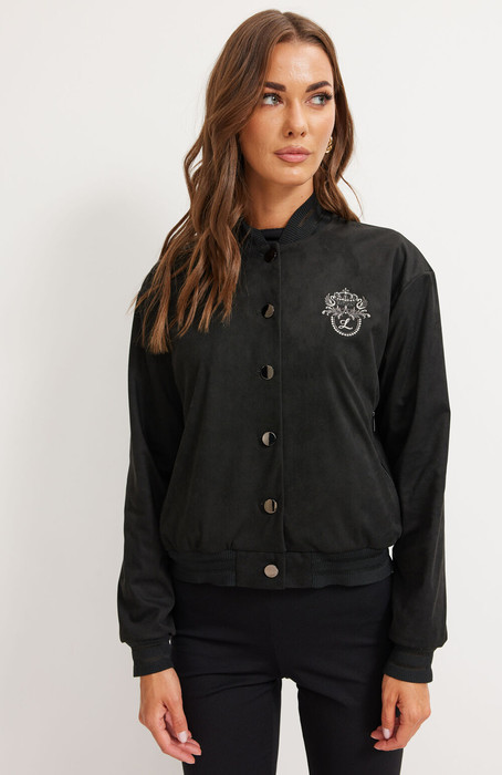 Бомбер прямого силуэта из экозамши. Горловина-стойка, по центру застежка на петли и пуговицы. Рукав втачной длинный по низу манжета. По низу бомбера притачной пояс. На левой стороне полочки дизайнерская вышивка. Обращаем ваше внимание, что фурнитура может отличаться от фото.