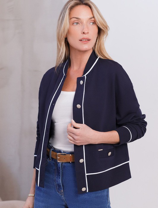Состав: 95%Хлопок 5%ПУ Плотность: 240 Г/м2Бомбер темно-синего цвета среднего объема с застежкой на пуговицы выполнен из премиального футера двухнитки плотностью 240 Г/м2. Натуральный состав ткани обеспечивает дышащий эффект, мягкость и приятные тактильные ощущения, Эластичный материал позволяет свободно двигаться без стеснения, а также отлично сохраняет форму даже после длительного ношения. Гладкая лицевая сторона придает бомберу опрятный и дорогой вид. Повседневный бомбер отличается аккуратным силуэтом без лишнего объема и универсальной длиной, которая идеально подходит для повседневного образа. Особенность бомбера - контрастные канты на горловине, манжетах, поясе и вдоль застежки, которые добавляют современный акцент и делают его более выразительным. Представленная размерная линейка позволяет подобрать оптимальный вариант для любой фигуры и размера, на маленький или плюс сайз, обеспечивая свободу движений без компромиссов по стилю. Этот легкий бомбер станет отличным дополнением к базовому гардеробу, сочетая практичность с элегантностью.