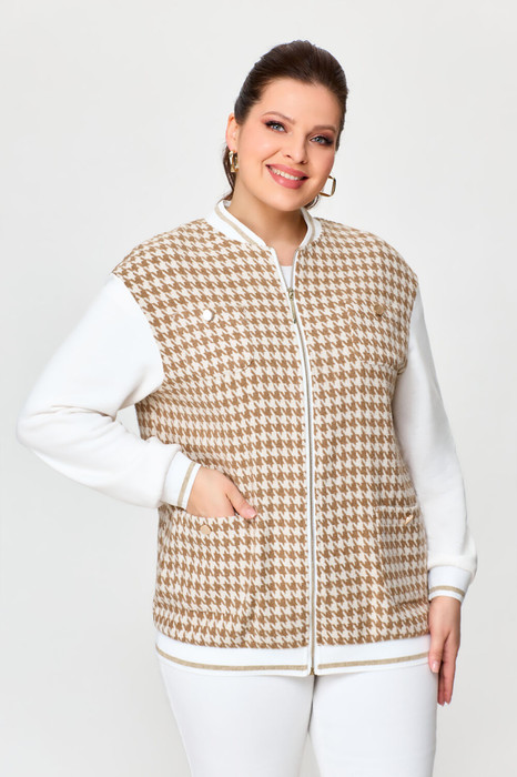 Бомбер женский прямого силуэта, с эластичным поясом по низу, со спущенной линией плеча. Застежка на молнию. Горловина круглая с эластичным воротником в виде стойки. Спереди два накладных кармана в верхней и нижней части. Рукава длинные, втачные из отделочной трикотажной ткани, по низу эластичные манжеты. Без подкладки.