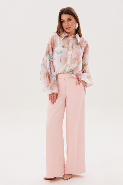 Брюки прямого кроя, по переду на брючинах стрелки. Модель с высокой посадкой на притачном поясе обеспечивает идеальное прилегание. Спереди расположена практичная застежка на тесьму-молнию, добавляющая удобства при носке. Брюки укомплектованы функциональными боковыми карманами.