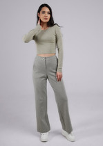 Брюки со стрелками, зауженные к низу. По передним половинкам выполнены наклонные карманы и складки по талии. По задним половинкам обработаны талиевые вытачки. В среднем шве передней половинки брюк обработана застежка на молнию. Брюки на притачном поясе с эластичной тесьмой и застежкой на петлю и пуговицу.