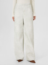 Брюки по переду со складками и боковыми карманами. Застежка на тесьму молнию спереди и петлю и пуговицу по поясу, пояс с эластичной резинкой сзади