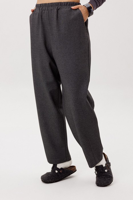 Идея повседневной элегантности обретает здесь свою совершенную форму — мягкий трикотаж, струящийся свободным кроем, нежно обволакивает фигуру, даря ей полную раскрепощенность. Высокая посадка становится основой безупречного силуэта, плавно ведущего взгляд от тонко подчеркнутой талии к изящному заужению книзу, созданному изящной вытачкой для идеальной посадки по ноге. Притачной пояс завершает эту гармонию линий, обеспечивая комфорт, который не приходится проверять, а боковые карманы добавляют практичной лаконичности.